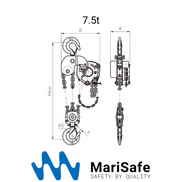 The MariSafe Chain Hoist 7.5 Ton is a compact manual chain hoist 7.5 ton designed for controlled lifting in marine and industrial environments, making it a reliable marine lifting chain hoist for shipboard maintenance and workshop use.